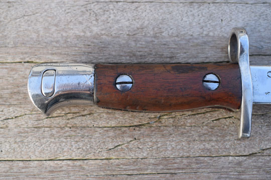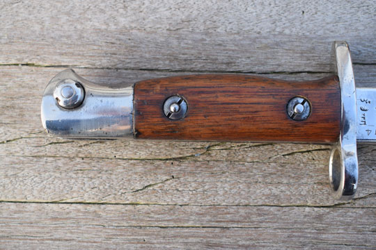 British Lee Enfield (SMLE) No.7 rifle. First pattern, quillon removed and no oil hole. Excellent bright polished blade with first 3 cm chrome plated. Crown ER 1907 dated 8 '9 and reissue date: 8 '14 (outbreak date of the Great War!). Maker's logo: EFD (=Enfield) on ricasso. British inspection (Enfield) mark and /I\ on reverse side of ricasso. Tip of the blade is rounded for drill purpose. Excellent chrome plated pommel with obsolete mark and D.P. (= Drill Purpose) on pommel. Chrome plated crossguard with muzzle ring. 16 mm. MRD. Excellent walnut grips.