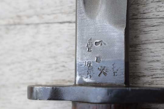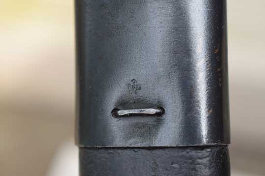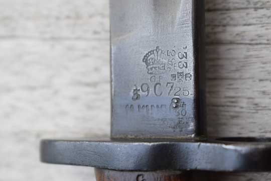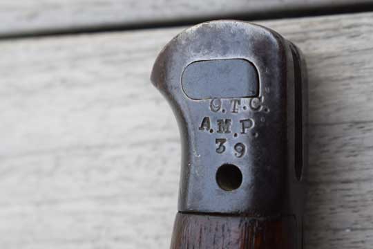 British Lee Enfield (SMLE) No.7 rifle. Serial number: 39 Matching! Second model. Excellent++ parkerized fullered blade. First 1,5 cm blackened. Ricasso is crisp marked: Crown over G.R. over 1907 and date 5'18 and with the English makers name: WILKINSON. There are three more issue dates: '25, '29, '33 and three Enfield inspection markings. Four Enfield inspection marks more on reverse side of the ricasso and a /I\ and X. and another '18. Excellent walnut grips secured to the blade tang by to screw bolts. Right grip is marked Y over 5. Excellent parkerized pommel and crossguard with muzzle ring MRD 15.4 mm. Oil hole in pommel. Pommel is unit marked: O.T.C. over A.M.P. over 39 (= Officer Training Corps at Ampleforth College. Rifle 39)