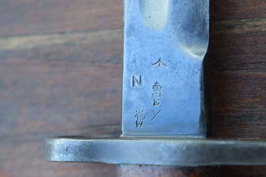 British Lee Enfield (SMLE) No.7 rifle. First pattern with hooked quillon and no oil hole in the pommel. Excellent blued finished blade. Ricasso is crisp marked with English makers name WILKINSON and Crown over ER over 1907 and very crisp dated: 11' 08. Clear British inspection marks, /I\, X, Crown over 48 over W and Crown over 114 over E. on reverse side of the ricasso and a large N for Naval use. Excellent blued pommel with muzzle ring and hooked quillon. MRD 16,5 mm. Excellent dark walnut grips bot stamped: Crown over 49 over W.