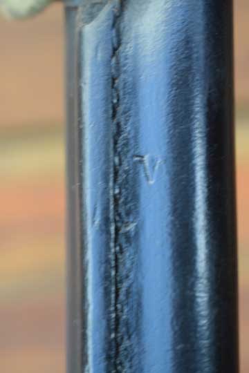 Excellent early black leather scabbard with nicely blued top mount and chape. Teardrop frog stud and three rivets. Leather body is marked: N for naval use.