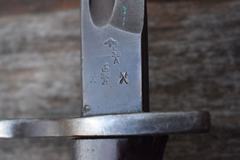 Lee Enfield M1914/US M17. Excellent++ grey parkerized fullered blade marked: 1913 over date 8 -16 over US makers trademark: W (=Winchester) crisp on the ricasso. On the reverse side three American controle markings : Crown over 36 over A, Crown over 31 over A and Crown over 36. There is a bend test mark: X and a /I\. Excellent parkerized pommel with no oil hole and crossguard with muzzle ring MRD 15,5 mm.