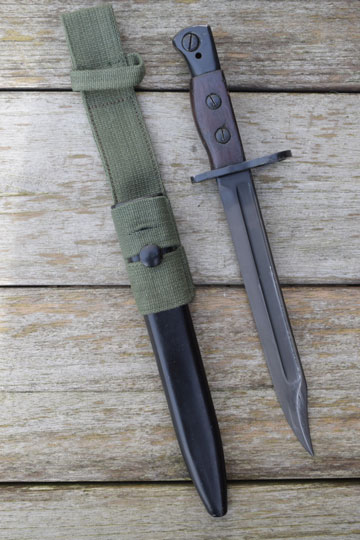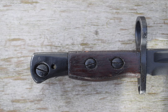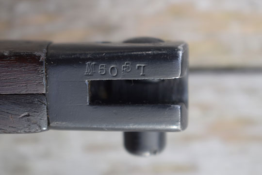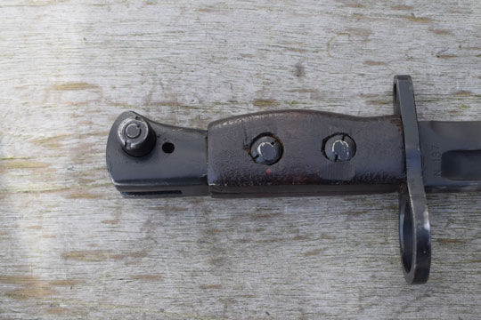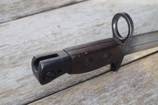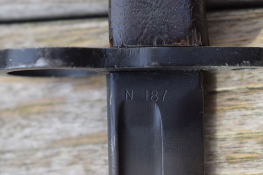 British 303 No.5 Jungle carbine MK1 and MK2. Minty parkerized fullered blade with Bowie tip. First 4 cm. are blackened. British makers dispersal code: N 187 (= Radcliff) ) crisp on the ricasso. Blackened pommel with circular mortise slot and clearance hole. Pommel is fixed to the blade tang by two rivets. The mortise is marked: M50 55 and L.(=?) reverse side of the pommel shows a large /I\. Excellent wrap around 2 parts wooden grip secured by two screw bolts. Blackened crossguard with muzzle ring MRD 22.5