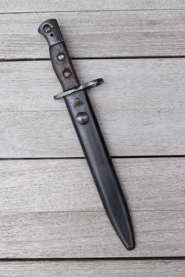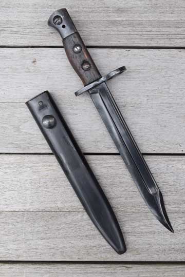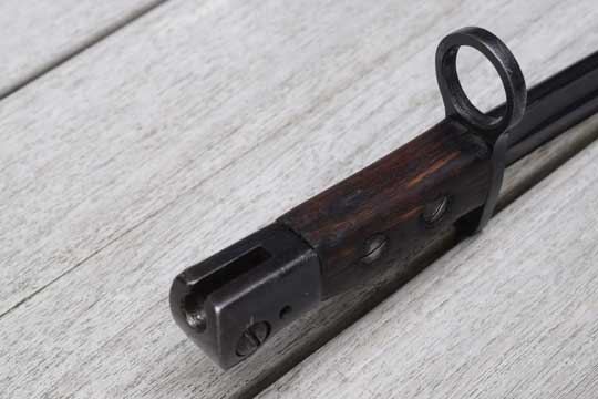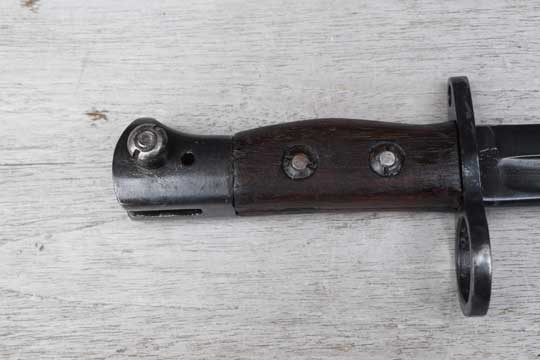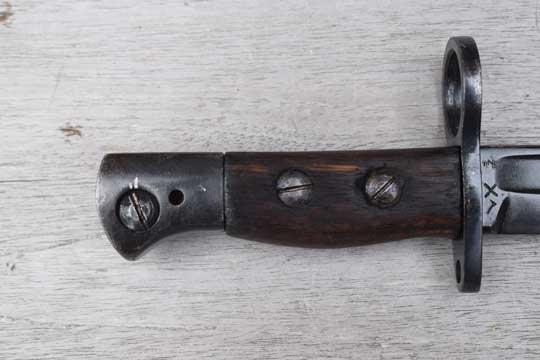 British 303 No.5 Jungle carbine MK1 and MK2. Excellent parkerized fullered blade with a Bowie tip. British makers trademark and dispersal code S294: W.S.C. (= Wilkinson Sword Company) on the ricasso. Reverse side is marked with a broad arrow; /I\, X and an Enfield inspection marking: Crown over Z over E Blackened pommel with circular mortise slot and clearance hole. The excellent wrap around 2 parts wooden grip is secured by two screw bolts to the blade tang. Blackened crossguard with muzzle ring MRD: 22.5