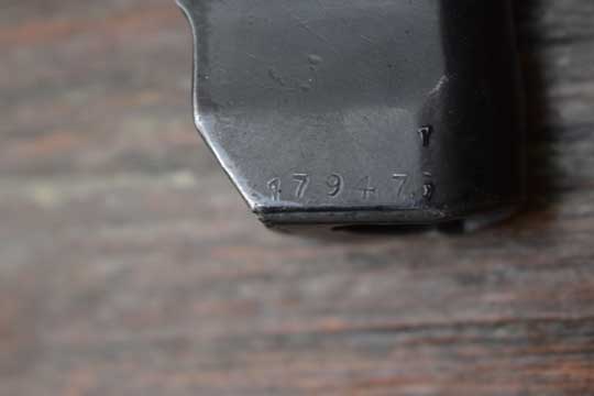 British .303 Enfield no4 rifle, MP Sten Mk V. Serial number: 179477 on the left side of the pommel and 38 on the right side. Excellent+ bright finished fullered Bowie style blade with first cm blackened and crisp No7. MK1/L on the ricasso and /I\ over M78 (= dispersal code of Elkington: M78) faint on the reverse side.