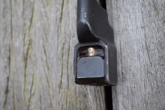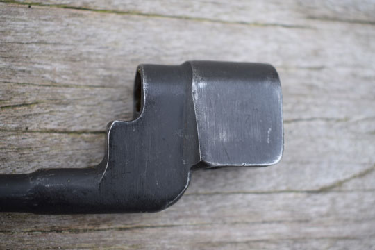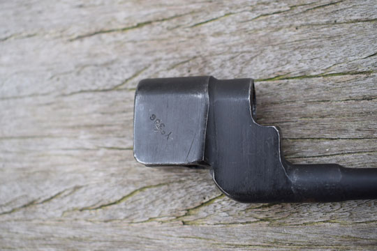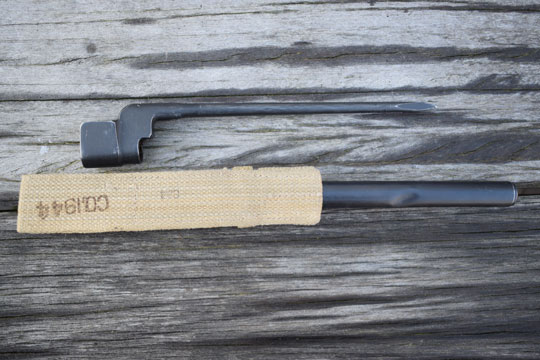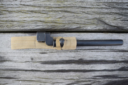Enfield 303. No.4 rifle. Excellent parkerized socket and round blade made from one piece of steel. Excellent blade tip. Socket is marked very faint No4 MKII and N67 (= Dispersal code for Singer) Reverse is marked Yc306 and there is another marking on the press stud N67. Comes with the rare and experimental MkII steel tubular scabbard made by Franco-British Electical Company, Tempel Park, Hurley, UK. Excellent blued example with one small single dent and alloy throat marked with a W in a circle and /I\. Comes with a MINT P 37 variation khaky frog (AC 162) marked CA1944