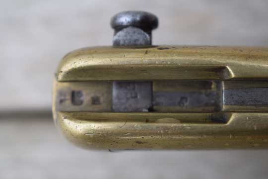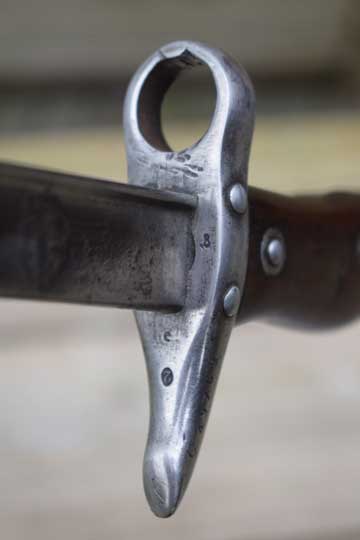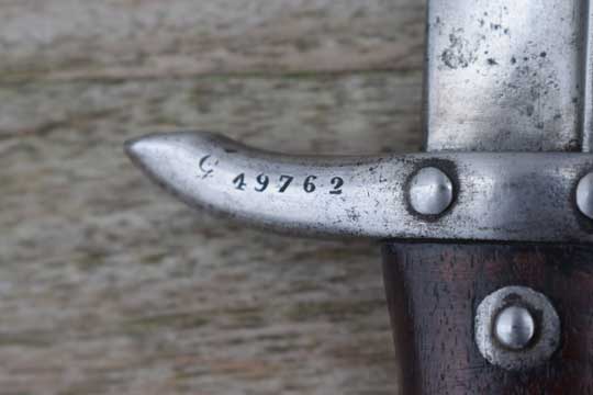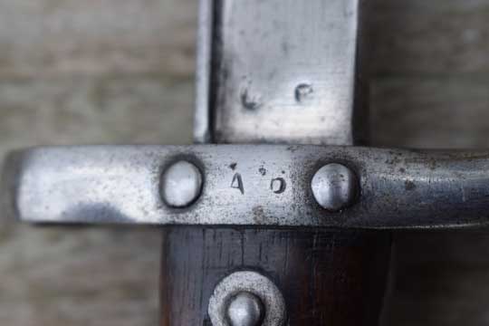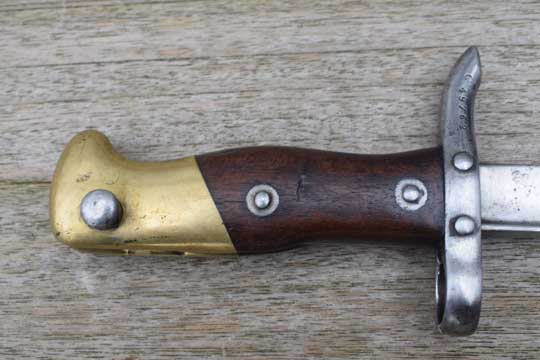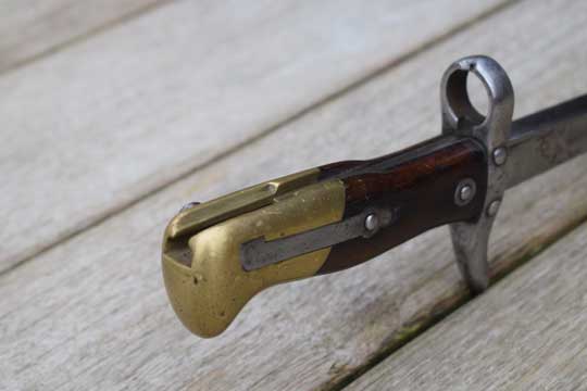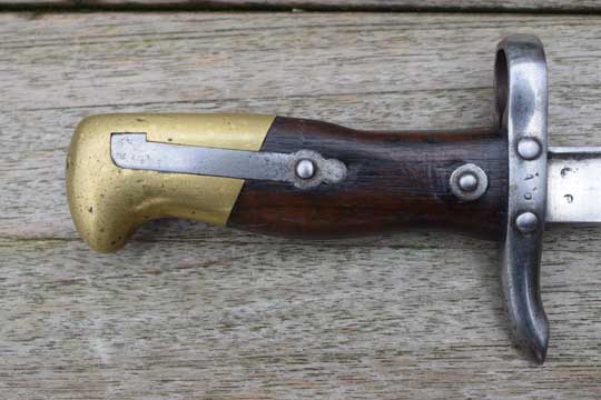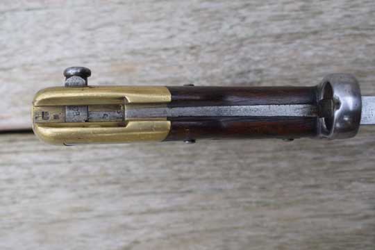 Unknown British rifle. French serial number: C 49762 on the quillon. Excellent shortened bright T-shaped blade. French makers name and date on the blade spine. M.re d' Armes de st. Etienne Janvier 1875. (=St. Etienne Arsenal, January 1875) Excellent brass pommel with diverse markings in mortise slot. Crossguard with shortened guillon. New added number: A 6 on the crossguard. Crossguard, facing the blade shows several numbers and markings. Screw- tightening device removed from muzzle ring. Muzzle ring is very carefully closed and MRD reduced to 17 mm. Excellent wooden grips riveted to the blade tang. External leaf spring. Overall length 433 mm.