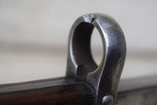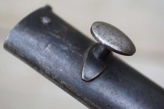 Excellent blued modified Gras M 1874 scabbard. It is shortened on both sides and the French type loop replaced by a rather unusual oval frog stud for fitting the English belt frog.