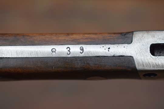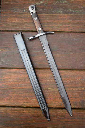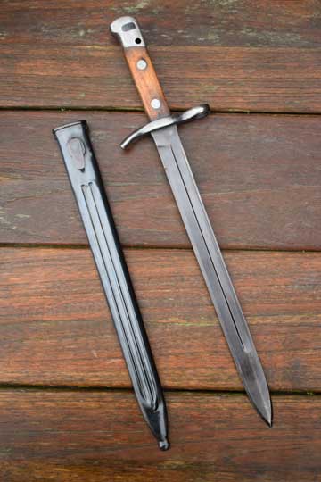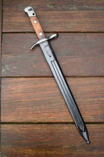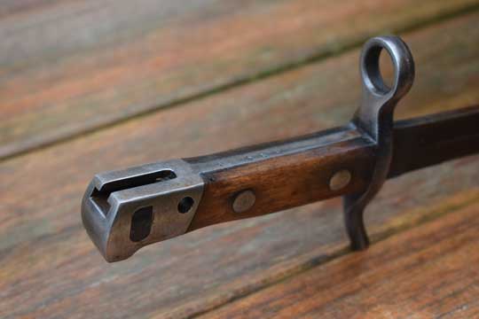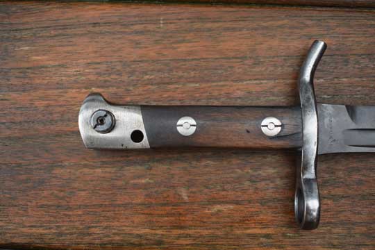 Mosin Nagant M 1927, 28 SK, 28-30 SK, M 39. Serial number: 839 on blade tang. Army model. Excellent+ blued concave blade with Finnish maker's name; HACKMAN & Co. on ricasso. Oil hole in pommel. Light blued pommel and crossguard with muzzle ring. MRD 16.7 mm. Blued catch and release button. Excellent wooden grips fixed to the blade tang by screw bolts. Muzzle ring MRD 16.7 mm.