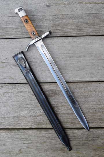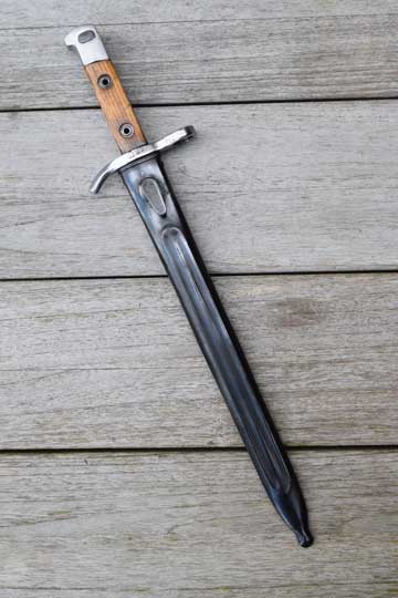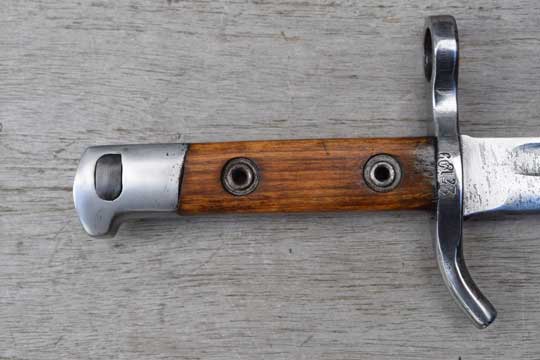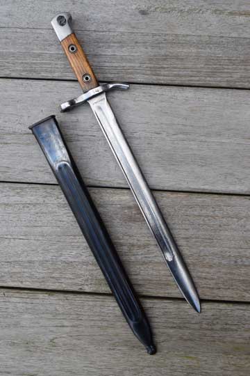 Mosin Nagant M 1928 SK rifle. Serial number: 60123 on the ricasso. Excellent- bright finished convex fullered blade with the Finnish maker's name; HACKMAN & Co on the ricasso. The blade shows some very fine peppering only. Excellent bright finished pommel and crossguard with a muzzle ring and a short quillon. T-Slot in pommel. Number on the top of the pommel: 49. Crossguard is marked: =S= (= Civil (Home) Guard) . MRD 16.2 mm. No oil hole in pommel. Blued catch. Excellent+ light colored selected wood grips with clearly visible grains, riveted to the blade tang by two steel hollow rivets.