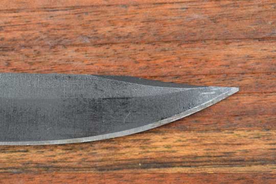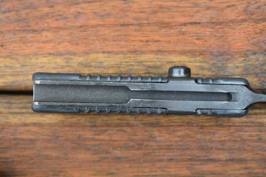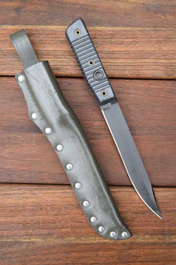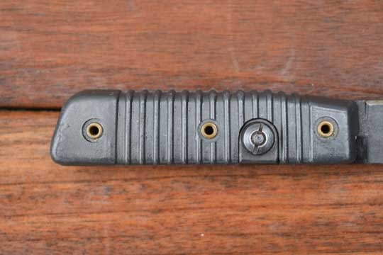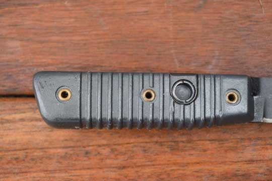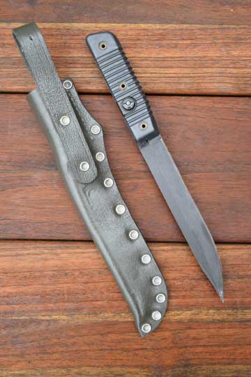 Finnish Valmet R K 62 Automatic rifle. Second Pattern. No serial number as usual. Minty blackened sharpened straight plain fixed blade with a smal false edge. Dark gray/green two piece plastic ribbed grip, fixed to the blade tang by three brass rivets. 13 ribs to the grip. Mortise slot forming one single piece with the blade. No crossguard. Catch position is close the ricasso. No makers name to the grips.(= Second Pattern)
