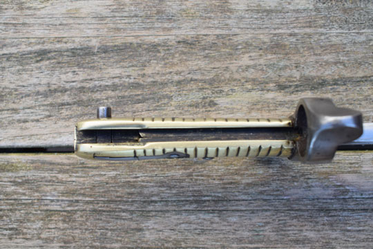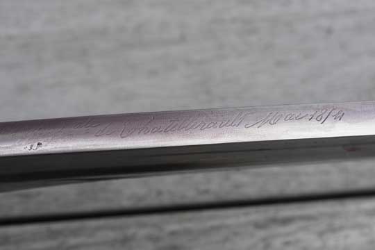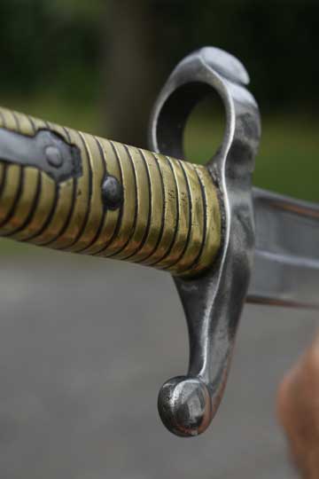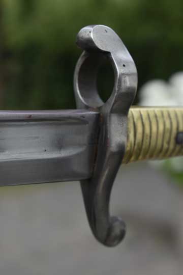 Carbine M 1829 T. No serial number. Superb bright finished fullered yataghan blade. Faint marking on ricasso. Blade spine is marked with makers name and date: Mfr. Imp'ale de Chattelerault, Mai 1874. Excellent brass hilt with short external spring. T-slot in pommel. Beautiful bright finished crossguard with back swept quillon and muzzle ring. MRD 23,5 mm. Excellent blackened metal scabbard with no dents.