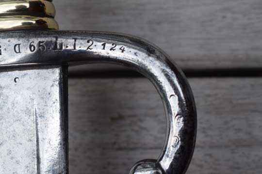 French Chassepot M 1866 rifle. Serial number: D 5395 on the crossguard. Very good fullered bright finished yataghan blade. Stained blade with area of peppering/ fine pitting. French maker mark and date: Mr'e. Imp ale de Mutzig aout. 1867 (= Made by the Imperial Mutzig Arsenal, August 1867) crisp on the blade spine. Right ricasso with two French inspection markings. Revers side is marked: 6. Excellent+ brass grip with a blued spring. Bright finished crossguard with guillion and muzzle ring. MRD: 17.5 mm. Crossguard is German (Prussian) unit marked: 65. L. I. 2. 124. (= 65th. Rheinisches Landwehr Infantry Regiment, 2nd Batallion, Rifle 124. Homebase: Cöln ) 3 French inspection markings on the left side of the quillon. Tightening screw on top of the muzzle ring
