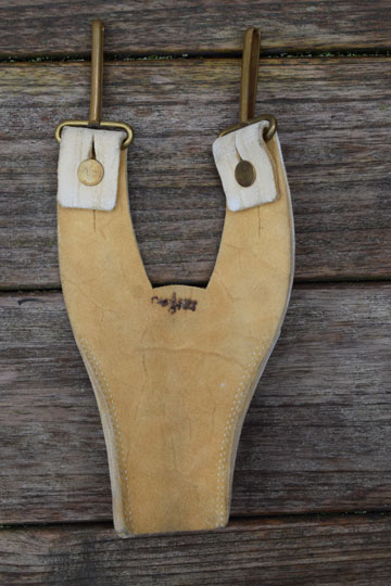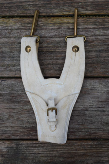 French white buff leather bayonet frog used by the Gendarmerie and the Republican guard of Paris in full dress. These frogs were used with the M1874 Gras bayonet, the M1886 Lebel, M 1890 Gendarmerie and the M1892 Mannlicher Berthier bayonets. Brass buckle and attachments hooks. No markings.