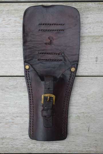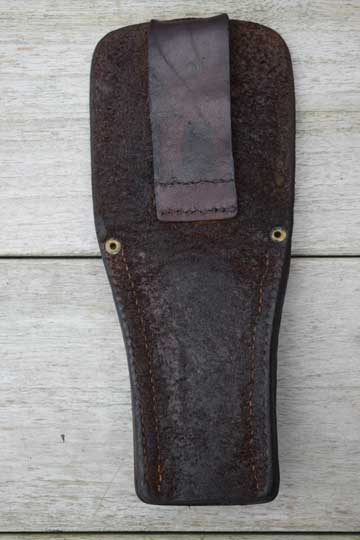 Excellent dark brown leather M 1892 frog. Belt frog for the Mannlicher Bertier M 1892 bayonet. Brass buckle. Loop attached by two pairs of parallel lines of stitching. Bras buckle. All stitches intact and supple leather. Genuine example. (AC 242)