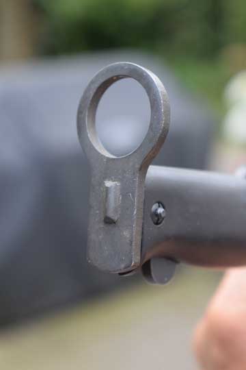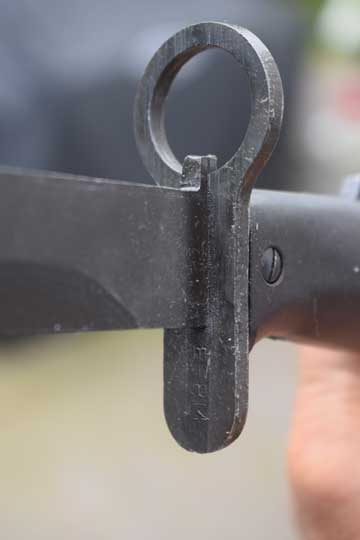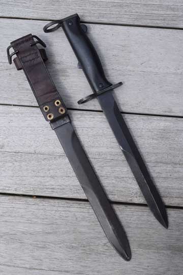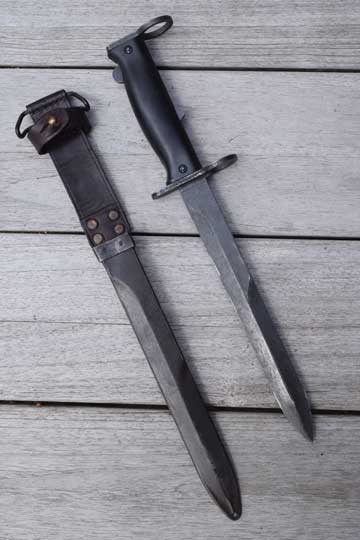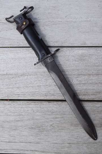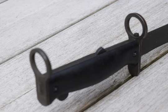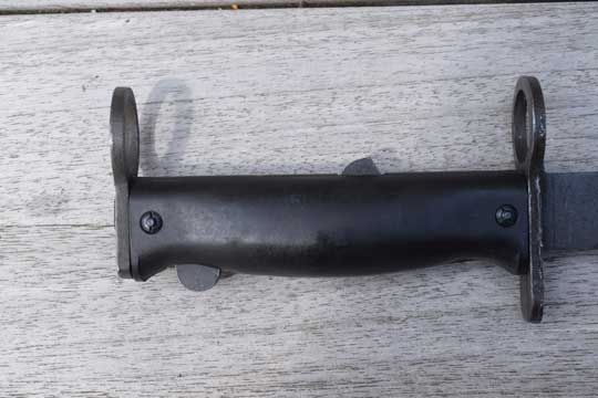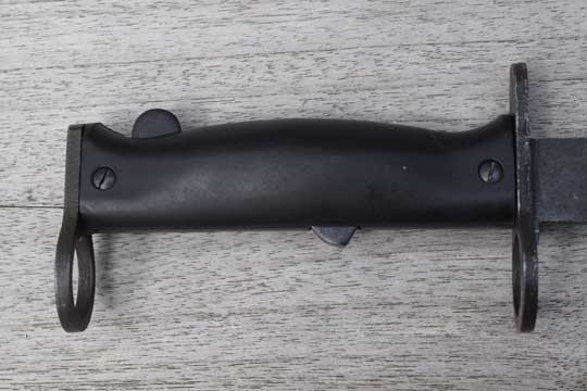 French MAS 49-56 rifle. No serial number. Excellent+ phosforized long plain blade with long false edge. Black plastic grips fixed to the blade tang by two small spanner bolts. Release catch in hilt. Press stud in blade tang. Muzzle rings on both sides of the grip. MRD 22 mm. Total length 344 mm. Ricasso is marked E-RM. (=Establisment Regional du Materiel)