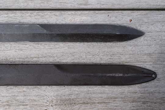 Grey phosforized steel scabbard with the profile of the long false edge of the blade. No dents to the scabbard. Brown leather integral frog fixed with four large brass rivets to the scabbard body. Frog with US belt hook and retaining strap. Scabbard is marked: E FF in an oval.