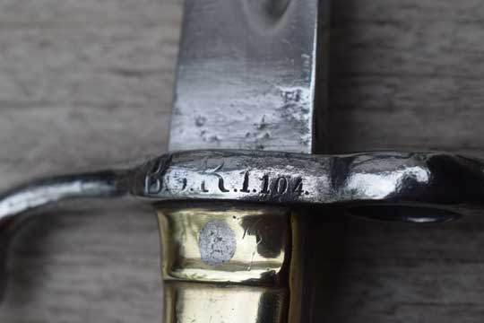Unusual: no makers name, no date nor inspection markings. Excellent brass grip with a blued external spring. Excellent bright finished steel crossguard with a quillon and muzzle ring. MRD 17,4 mm. Left crossguard is Bavarian unit marked: B. 19. R. 1. 104. (= 19th. Royal Bavarian Infantry regiment King Victor Emanuel III of Italy. Home base: Erlangen. First battalion. Rifle No. 104.)