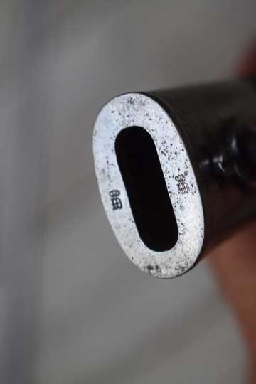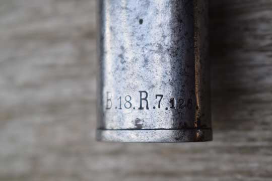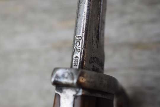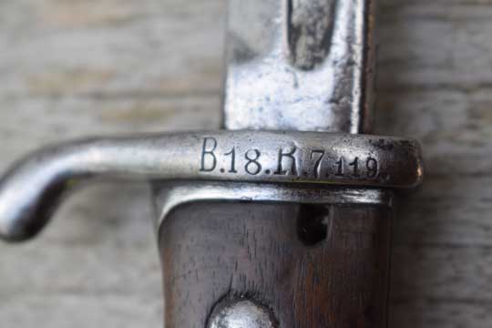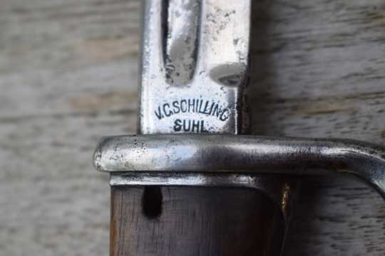 Mauser M98 rifle. Excellent- bright polished pipeback blade with German makers name: V.C. SCHILLING over SUHL on the ricasso. There is a very light field sharpening and some action spurs only. Bavarian King's cipher: Crown over O over 06 (=King Otto of Bayern, 1906) and a Bavarian inspection mark all crisp on the blade spine. Excellent pommel with two Bavarian inspection markings and a Bavarian unit marking on the crossguard: B. 18. R. 7. 119. (= 18th. Bavarian Infantry Regiment: Prinz Ludwig Ferdinand, Home base Landau (Paltz), 7th. Company, and rifle number 119 ) and a crisp inspection marking. Excellent wooden grips fixed to the blade tang by two screw bolts.