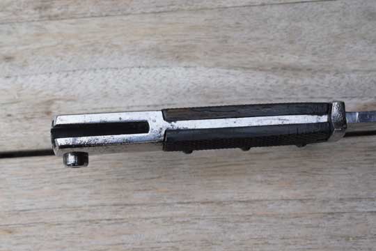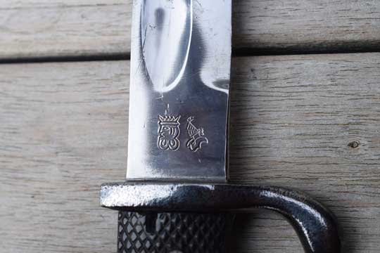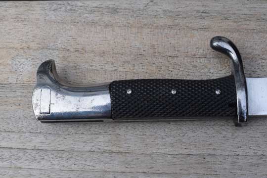M 1898 Officers Kurzes. Superb bright finished fullered blade. German makers trademark: Kings head and Knight helmet on the ricasso. (= Weyersberg & Kirschbaum-Solingen. This trademark was used from 1883 till 1918. ) Excellent bright polished steel bird head pommel with large beak. No functional T-O slot. Working press button. Bright finished crossguard with short backwards swept quillon. Beautiful checkered hard rubber grips with oil holes on both sides, secured by three steel domed rivets.
