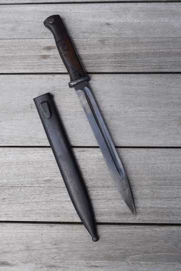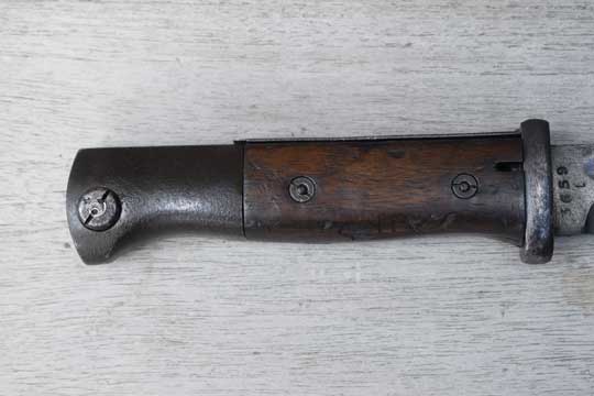 Mauser K98. Serial number: 3659 over t on the ricasso. Excellent++ fullered dark blued blade with WWII makers letter code: 42 cof (= Carl Eickhorn- Solingen 1942. Code used from 1940-1945) on the ricasso. Reverse side with the serial number. Excellent blued pommel and crossguard. Flash gard with no serieus dents. Two German Waffenambt markings on the pommel. Very good wooden grips, showing some light abuse only, secured to the tang by two screw bolts.