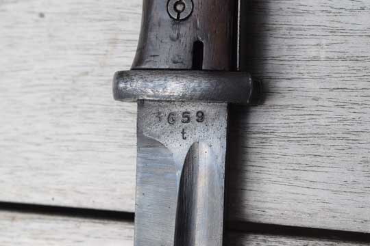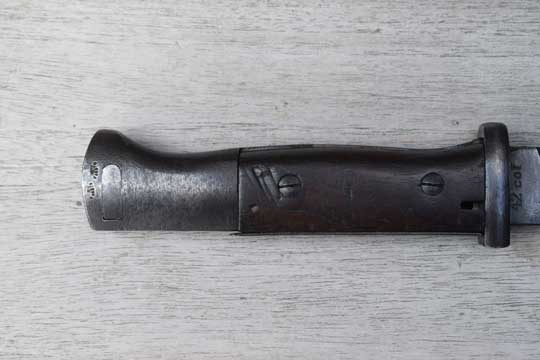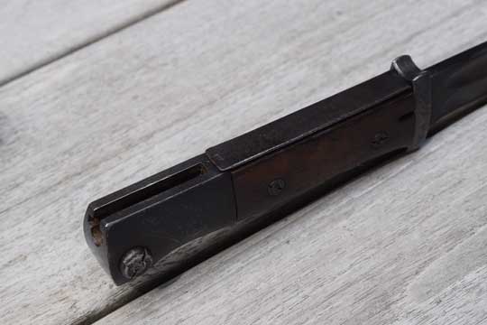 Excellent (not matching) blued/blackened scabbard, with no dents. WWII makers letter code and marked: 43 cof and the serial number: 5265 over G on the reverse site.