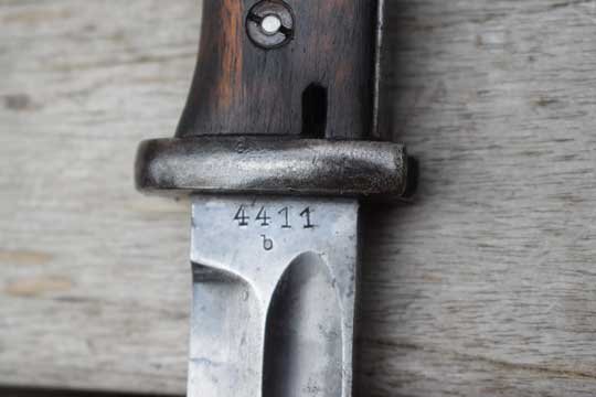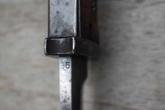 Mauser K98. Serial number: 4411 over b on the ricasso. Excellent fullered blued blade with secret makers mark: S 172 (= S code of Carl Eickhorn- Solingen ) on the ricasso. Reverse side with serial number and dated '36 on the blade spine. Excellent blued pommel and crossguard. Flash gard with no serieus dents. Two early German droopwing Waffenambt markings WA256 on pommel. Very good wooden grips, showing some light abuse only, secured to the tang by two screw bolts.