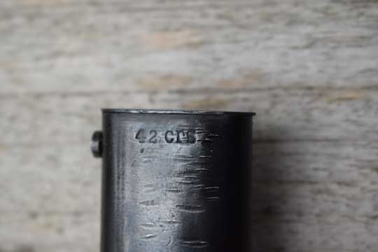 Excellent (not matching) wartime maker marked and later dated blued scabbard, with user spurs but no dents, marked: 42 crs (= Paul Weyersberg & Co 1942) and the serial number: 1890 over e on the reverse site.
