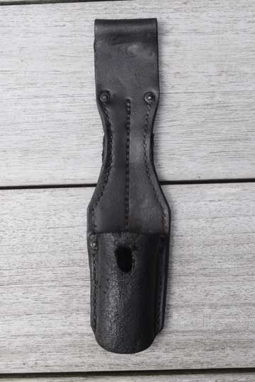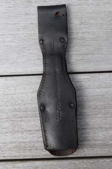 German M 1884/98 bayonet frog. Excellent flexible dark brown leather bayonet frog, made with 4 alloy rivets and alloy washers. Oval frog opening. Central stitching. Retaing strap cut away. No markings.