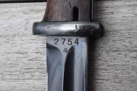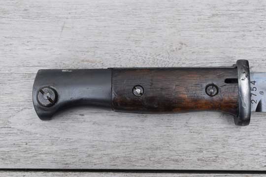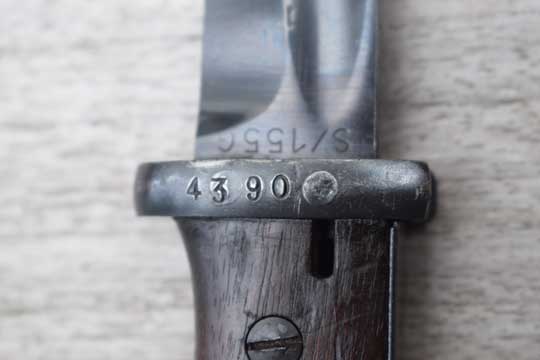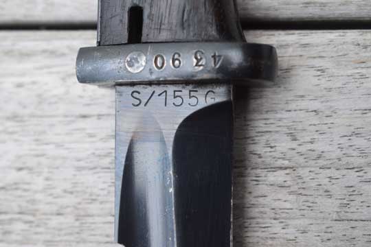 Mauser M98 rifle. Serial number: 2754 over e on the ricasso. Another unknown serial number: 4390 is stamped on the crossguard. Excellent blued fullered sawback blade with a crisp secret German maker's S-code: S/155 G (= E. u. F. Hörster - Solingen 1935) on the reverse side of the ricasso..
