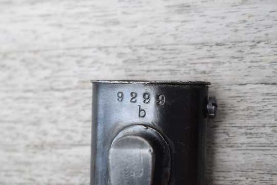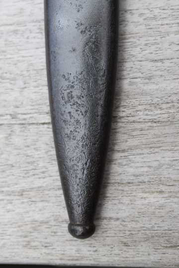 Excellent- blued WWII steel scabbard marked with the name of a rare maker: J.Sch 1941 (= (Jetter und Scheerer- Tuttlingen 1941) and serial number: 9299 over a. No dents to the scabbard but some peppering/pitting near the tip only.