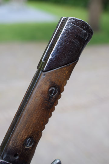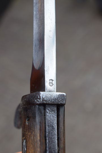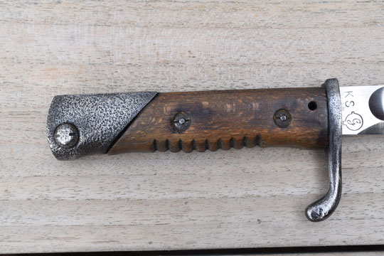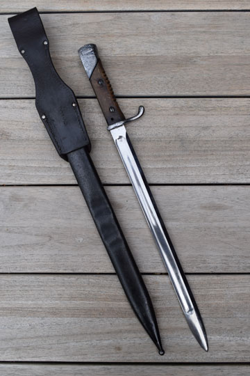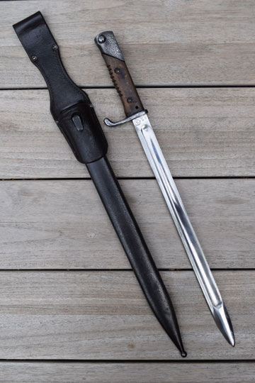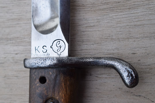 Mauser M 1888 rifle. Beautiful bright finished blade with a wide fuller on both sides. German maker's logo: G in a vacuum tube (= Dr. Lucian Gottscho - Berlin) and a capital K S on the ricasso. Crisp German inspection marking on the blade spine. Very good- bright finished pommel with TO- slot and crossguard with back swept quillon. Quillon with light peppering only. Flat pommel shows peppering and light to moderate pitting. Catch works fine. Excellent and intact one piece beach wooden grip wrapped around the blade tang and fixed by two screw bolts. Round oil hole. Grip has 9 short ribs. No flashguard.