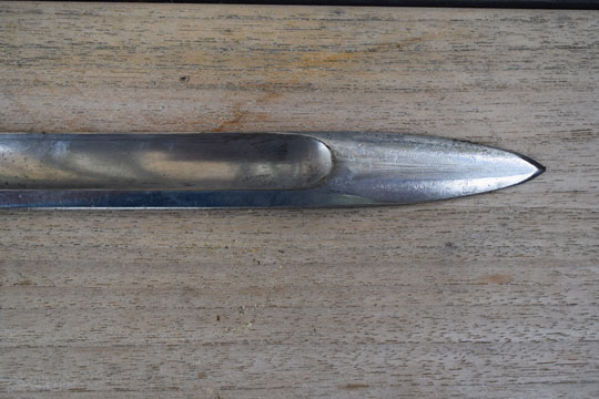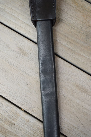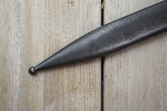Excellent and correct very very fine peppered steel tapered scabbard with only a few small dents to the reverse side. Its large throat is fixed to the scabbard body with two screws. Ball finial .