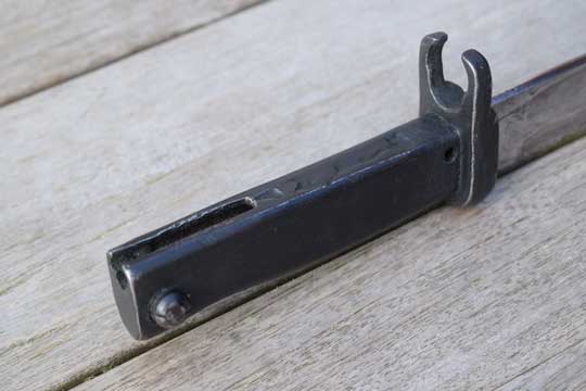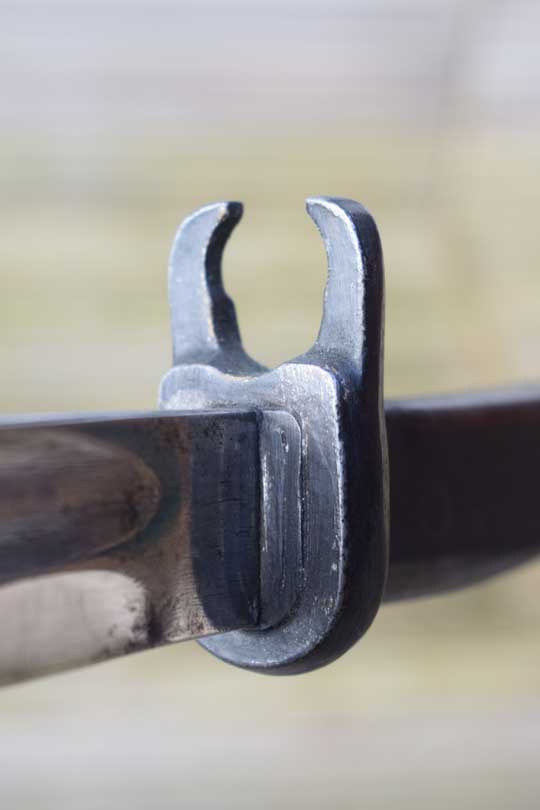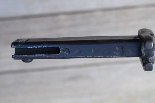 German M 1888 Commission rifle and Mauser M 1898 rifle, French Lebel rifle, Russian Mosin Nagant (with adapter). No serial number. Excellent bright finished fullered blade with a German inspection marking on the blade spine only. Black painted sheet steel hilt with oil hole near the crossguard. More rounded pommel. Excellent cast one piece crossguard with double diameter open type muzzle ring.