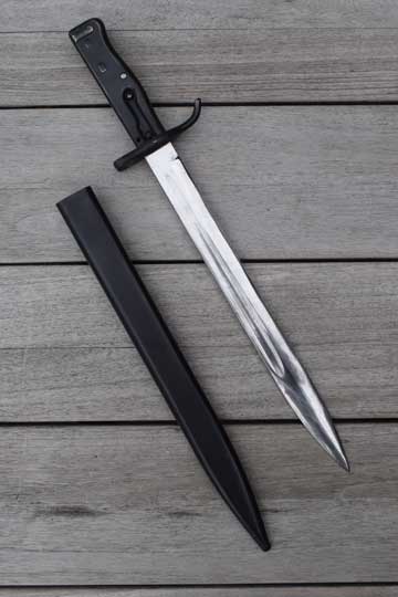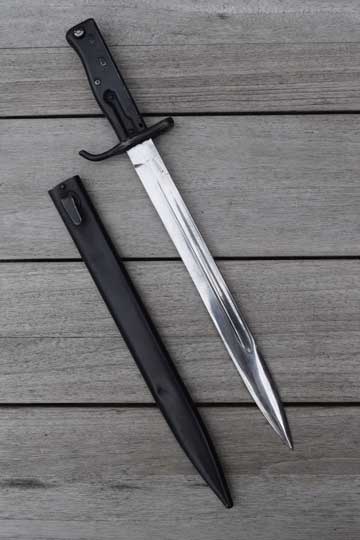 German Mauser M 1898 Rifle, M 1888 rifle and French Lebel and Russian Mosin-Nagant rifles with adapter. Ersatz bayonet. Excellent bright finished straight fullered blade. (Ref. EB47). Gothic inspection marking on the blade spine.