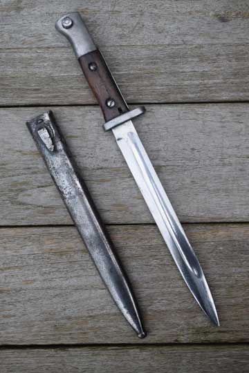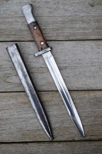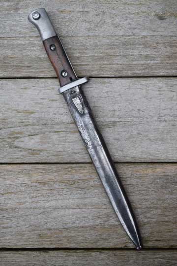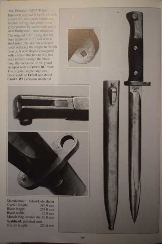 An extremely rare trials bayonet for the experimental M 88/95 Mauser rifle which later became the Mauser M 98 rifle. Made in 1917 from an existing M1884/98 Second model bayonet. Not much is known about this bayonet. Only recorded by Roy Williams in his book: The collectors book of German bayonets 1680-1945 Part One Page 508- Item 364. (see last pict.)