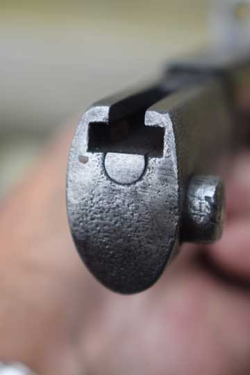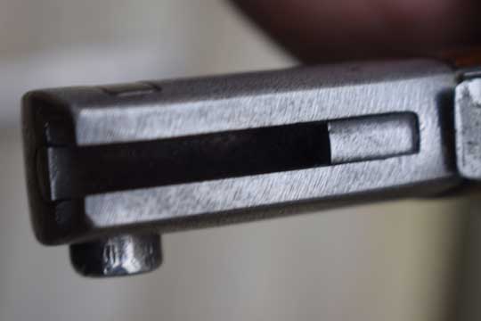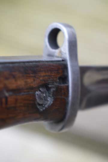 Prussian W over date: '17 and Crown over a Gothic inspection mark on the blade spine. T-O slot in the pommel is altered by an insert and changed to a short mortise with a T slot. The length of the mortise is now 30 mm. Crossguard replaced by a new crossguard with a very small ring (0,9 cm!) to fit the cleaning rod and not the muzzle. Clear German controle marking on the new crossguard. Very good wooden grips secured with screws and bolts to the blade tang. Left grip with a crack. Excellent modified flash guard.