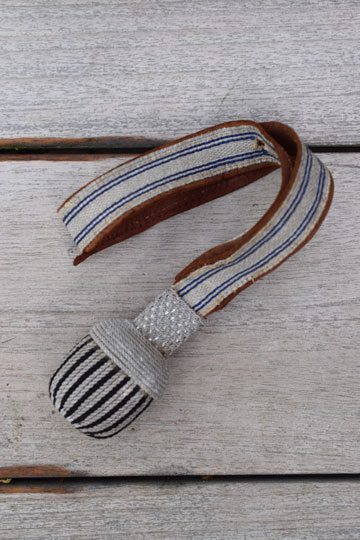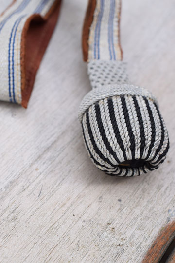 White strap with two double dark lines. Brown leather inside. White twisted cord crown. Ball is made from black and white twisted cord. Black core