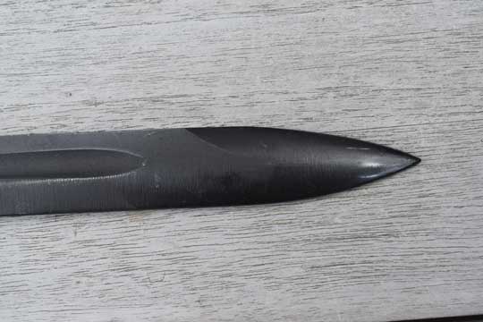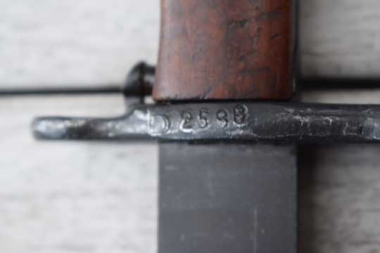 US M1 Garand rifle. Serial number: B 2588 on the crossguard. Excellent + dark parkerized fullered blade with a false edge. No maker markings to the ricasso of the blade. Blade shows user spurs and fine field sharpening only. Excellent+ parkerized hilt with T slot in pommel. Excellent+ smooth wooden grips secured to the blade tang by one single screw. Crossguard with muzzle ring MRD 15.7 mm and a short straight quillon.