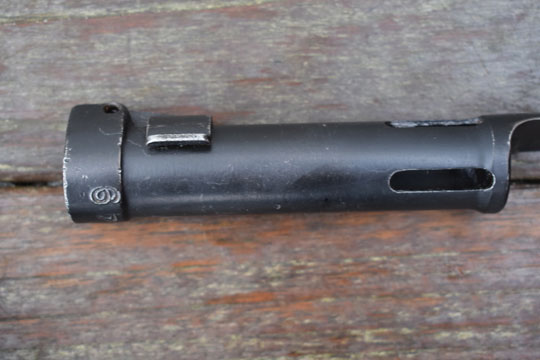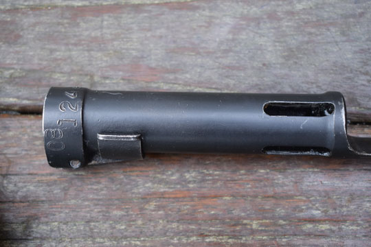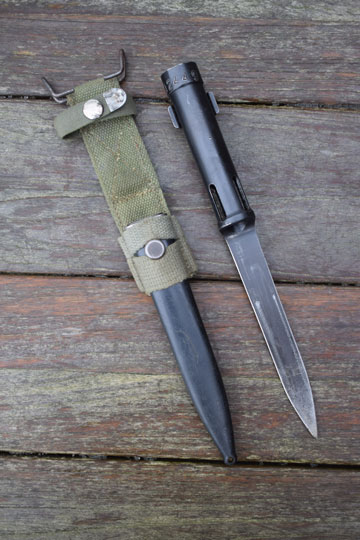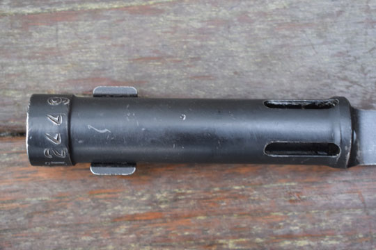 FN FAL and CAL. automatic rifle. Greece serial number: 08 12449 in large numbers on the top of the bayonet . Excellent bayonet, parkerised all over. Excellent parkerized blade with a flat upperside and a round underside. Excellent long cylindrical socket made out of one piece. Four slotted openings and smooth press catch with "wings".