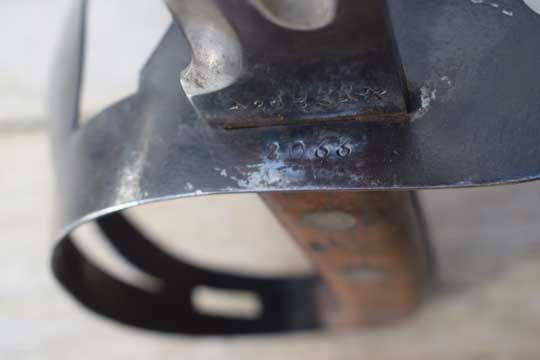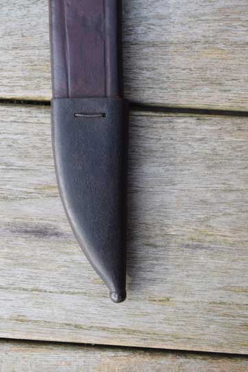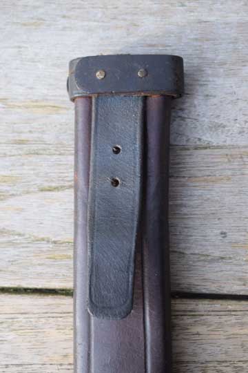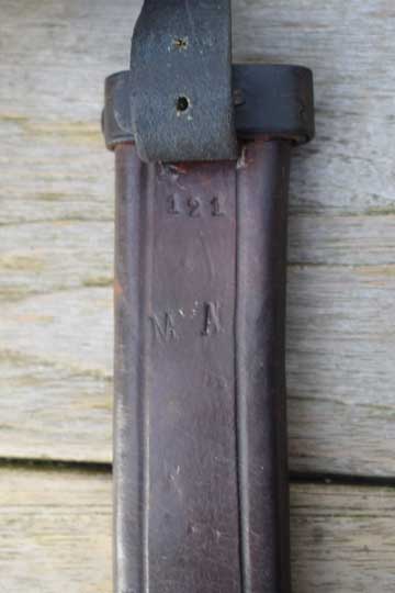 Excellent+ M 1898 tooled flexible brown leather scabbard. All stitches intact. Long M 1931 black painted steel chape fixed by a single steel staple each side to the leather body. Scabbard throat is reinforced by a black painted steel clip riveted to the leather throat. Leather body is marked: 121 over M A underneath the Intact leather frog strap.