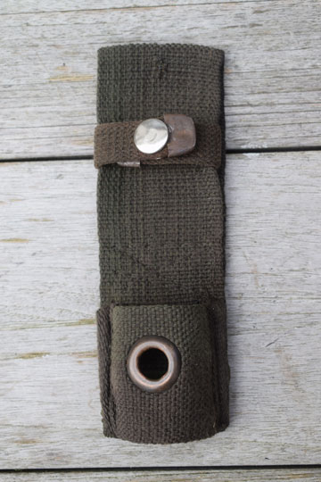 Genuine and correct green khaki frog for the Iranese G3A6 bayonet. Minty frog with a reinforced metal ring around the eyelet and a retaining strap with a brass push button.