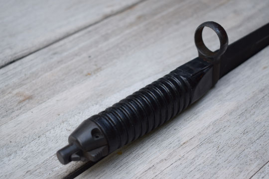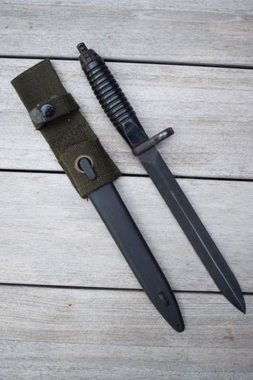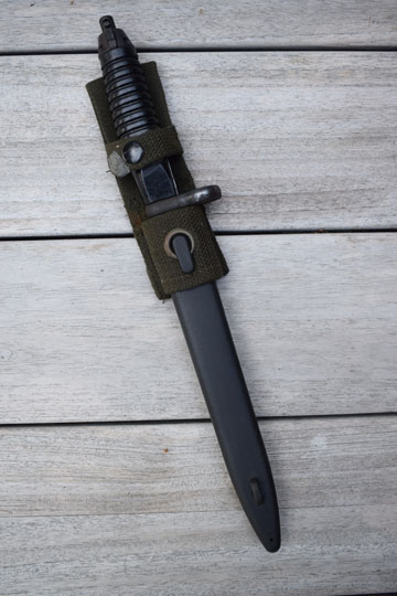 G3A6 Heckler & Koch automatic rifle. Minty long blackened double edged blade. Excellent two pieces 12 ribs black plastic grip. Large muzzle ring MRD 22 mm. Posforised metal pommel. Standard G3 slot. Correct black plastic scabbard with an opening for a lace approx. 3 cm from the tip. It has a metal throat.