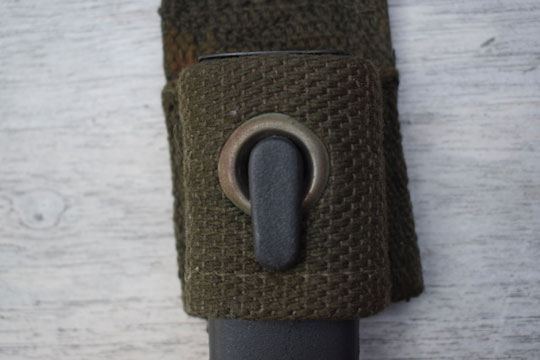 Comes with its correct green khaki frog with reinforced metal ring around the eyelet and retaining strap. Total length: 370 mm.