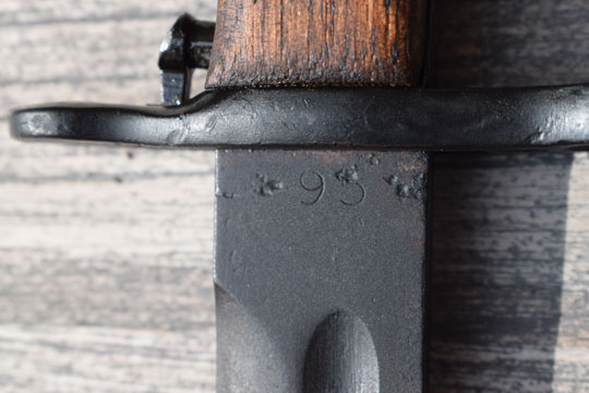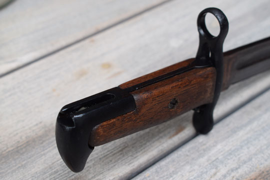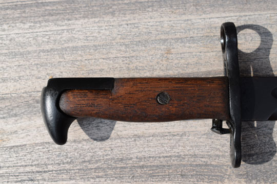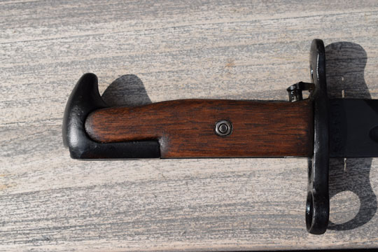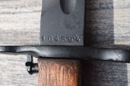 Italian Garand B M 59 rifle. Serial number 104594 on the ricasso. Very good typical Italian plum-browned fullered US blade with a serial number on the one side and a large 95 on the reverse side. Excellent blackened pommel and crossguard with muzzle ring. MRD 15.8 mm. Excellent and rare wooden grips secured to the blade tang by a single screw. Green painted leather scabbard with an American (Garand) type top mount with an integrated khaki frog and an Italian type chape. All stitches intact.