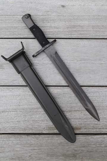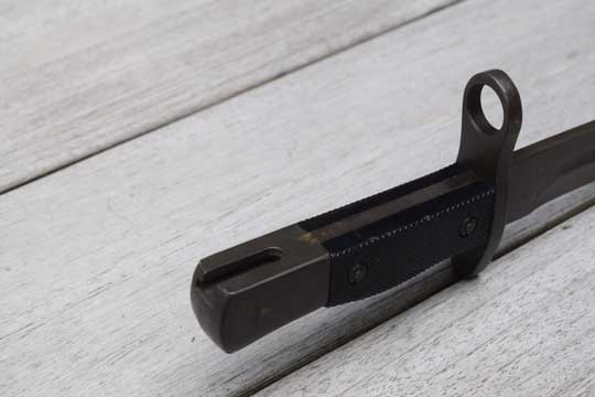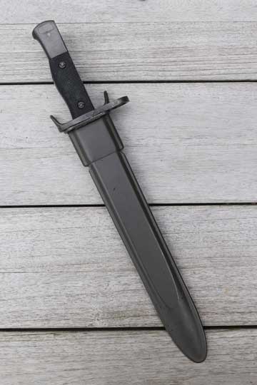 Italian produced Garand rifle for export. No serial number. Minty parkerized fullered blade with no markings. Blade with false edge. Parkerized pommel with T-slot and crossguard with muzzle ring. MRD 16 mm. Checkered black plastic wraparound grips secured to the tang by two screws. Minty USM7 type green plastic scabbard with a steel throat and belt hooks. No markings.