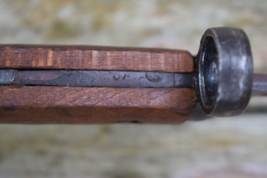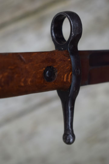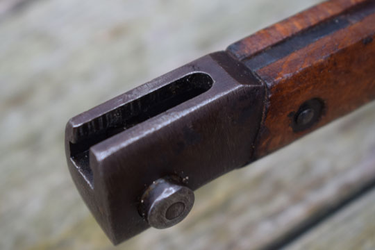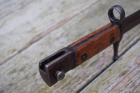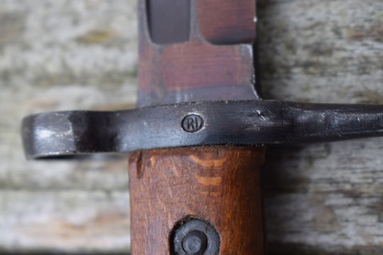 British SMLE MK3 rifle. No serial number. Excellent Italian plumb finished fullered M 1891 blade. Excellent short and more heavy and higher blued pommel and crossgard with a short quillon with ball final and a large muzzle ring MRD 16.5 mm. Crossguard is marked RI in an oval. Short mortise and T-slot in pommel. Minty wooden grips riveted to the blade tang. blade tangs shows an Italian inspection marking and a number: 6 (9?)