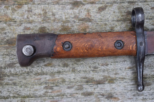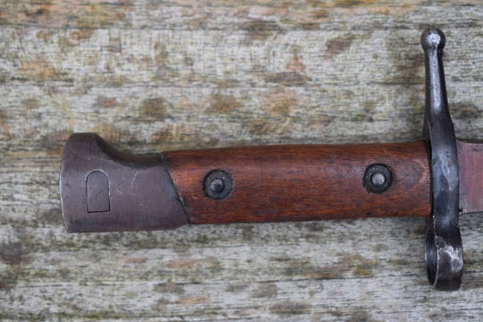 The Italians altered their old M 1891 Carcano bayonets for use with these rifles by replacing the crossguard by one with a larger muzzle ring and a different pommel and coupled it with a modified British Po.7 scabbard.