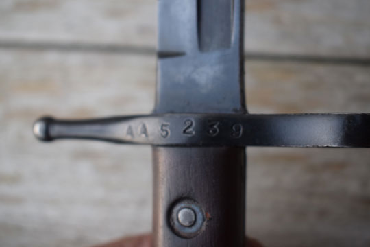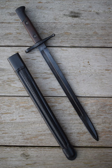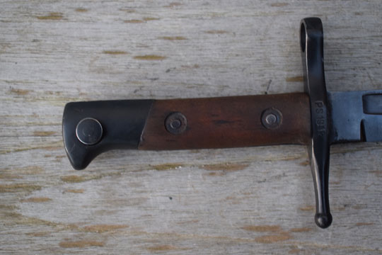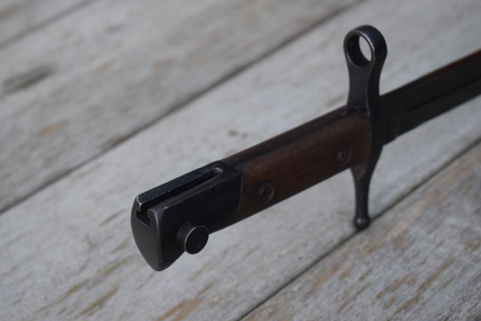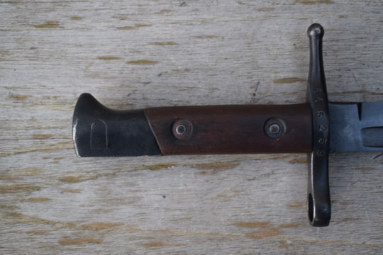 Italian M 1891 Mannlicher Carcano, cal. 6,5 mm rifle. Serial number: AA 5239 on the crossguard. Excellent blackened straight fullered blade. Blackened pommel with T-slot and crossguard with muzzle ring: MRD 13.0. mm. Excellent straight quillon with round final. Right side of the crossguard is maker marked and dated: PS 1942. Excellent wooden grips secured to the blade tang by steel rivets.