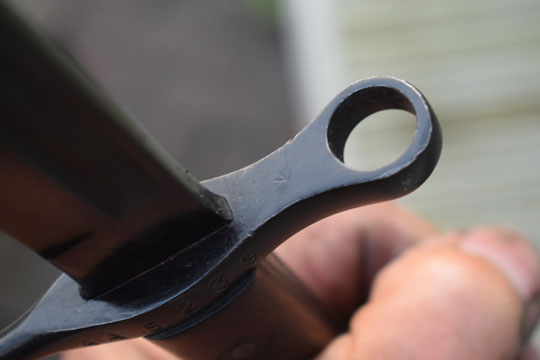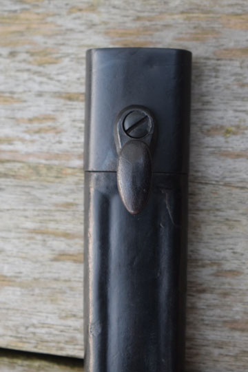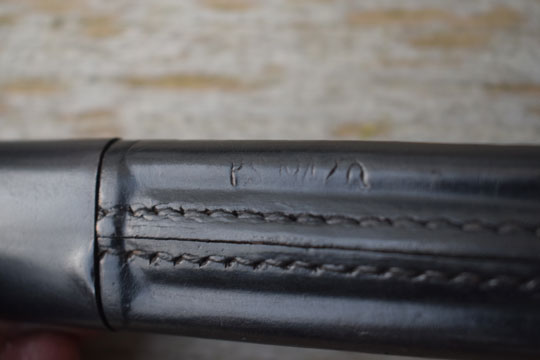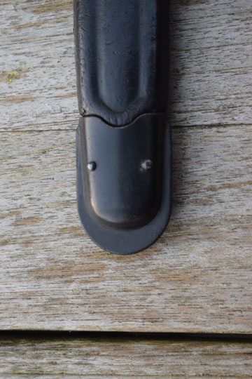 Excellent black leather scabbard with pinned on blackened mounts. Leather body is marked: PS 1942. Allstitches intact and no dents to the mounts..