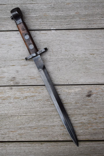 Of this very rare cavalry bayonet, only 17.000 were produced and only by the Dutch maker HEMBRUG in 1917. It was issued in 1918 and never made with a hooked quillon. Hard to find with its brown all leather scabbard.